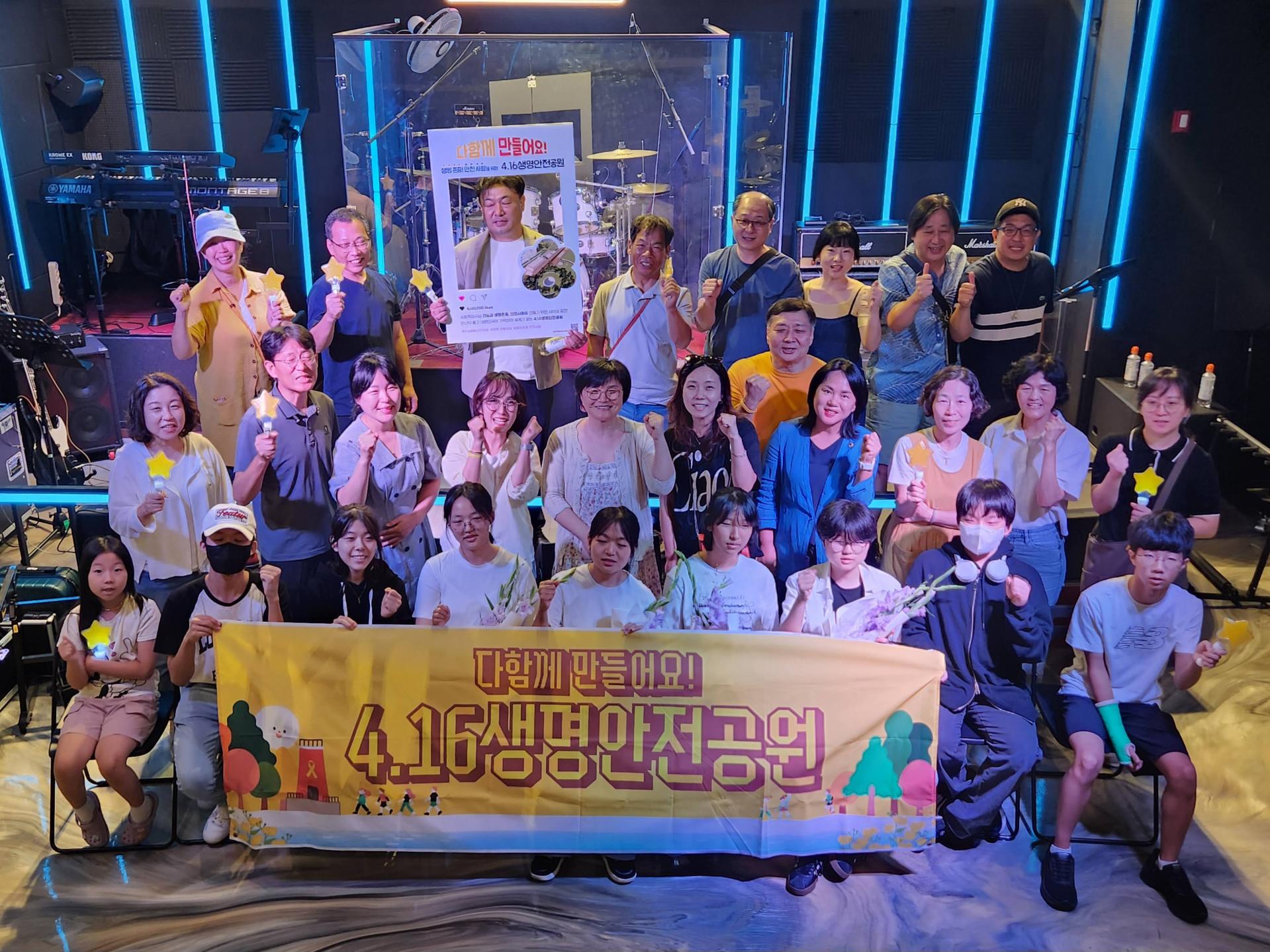 그래서 이번 공연은 어른들이 빚진 마음을 조금이나마 덜고 싶어 준비한 자리이기도 했습니다. 필요한 모든 것은 우리가 책임질 테니, 너희는 자유롭게 노래하라는 마음이었습니다. 유담이의 어머니 박나은 님은 참사로 희생된 아이들과 같은 또래의 자녀를 둔 엄마로서 특별한 마음을 담아 노래를 선물해 주었습니다. 또한 최순화 세월호가족협의회 대외협력부서장과 김현석 4.16연대 지역협력위원장도 자리해 감사의 인사를 전했습니다. 이어 416명의 시민 참여를 목표로 한 ‘4.16생명안전공원 챌린지’ 영상 상영으로 공연의 열기가 더해졌습니다.👍