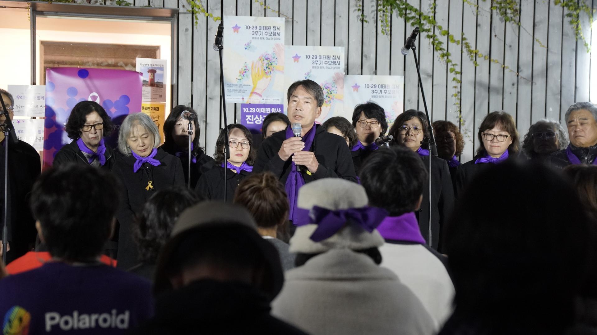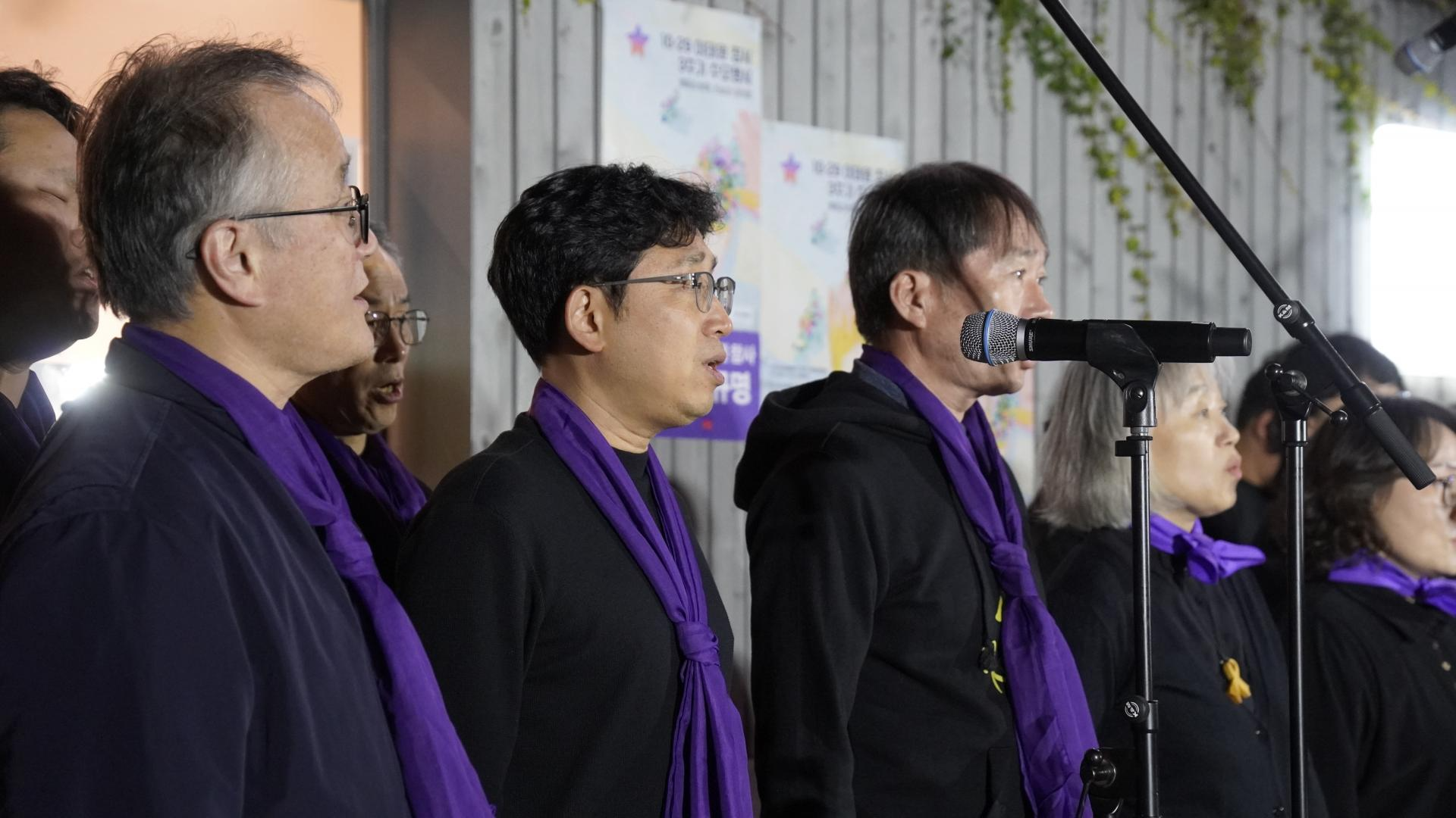 첫번째 공연으로 4.16 합창단이 함께 했습니다. 합창단원 모두 보라색 목도리를 맞춰 착용하며 애도의 뜻을 함께했습니다. 무대에 오른 4.16합창단은 노래 ‘가을 우체국 앞에서’를 부르며 가을 낙엽이 짙어지는 10월, 이태원 참사를 기억했습니다. 이어서 4.16합창단 단원이신 4.16 세월호 참사 가족협의회 희생자 창현 아버님이 발언을 이어갔습니다.