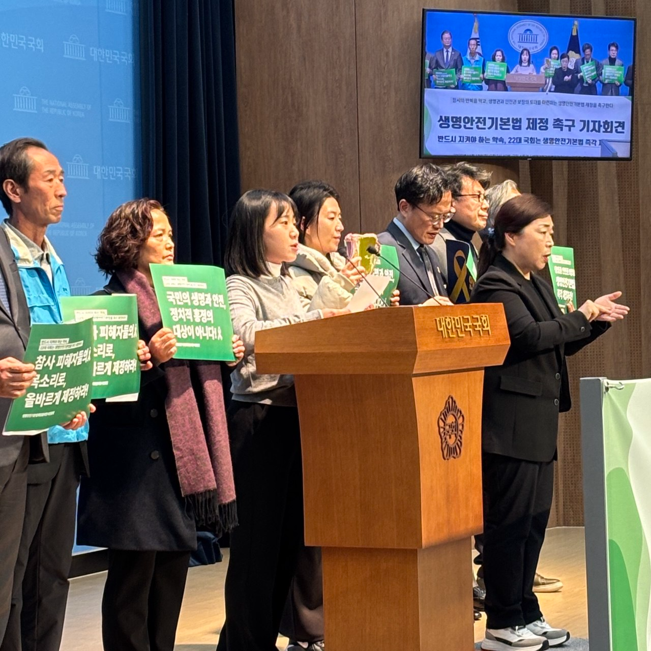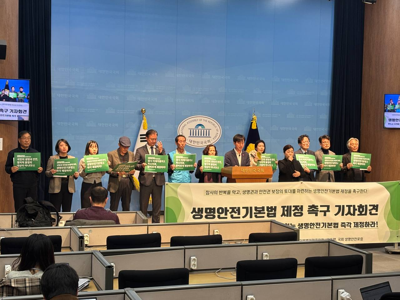 지난 11월 17일(월) 오전 9시 40분, 생명안전기본법제정을 위한 시민동행과 국회 생명안전포럼은 국회 소통관에서 생명안전기본법의 조속한 법 제정을 요구하며 기자회견을 진행했습니다. 생명안전기본법은 세월호 참사 이후 반복되는 재난참사, 산업재해 등 억울한 죽음을 막고자 피해자들의 호소로 만들어진 법안으로 생명권과 안전권을 법에 명시하여 국가와 기업의 책무를 명확히 하도록 법 제도를 촉구하였습니다.