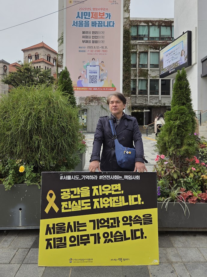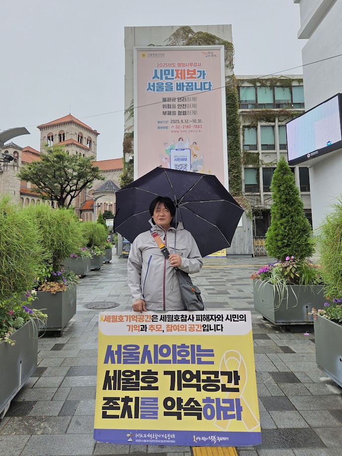 세월호참사는 정쟁의 대상이 아닌 우리 사회가 잊지 말고 기억해야 할 시대의 아픔입니다. 세월호참사 이후의 세상은 달라져아 하기에 우리는 세월호참사를 기억해야 하고 세월호 기억공간을 지키기 위하여 1인 시위 피켓팅이 2022년 7월 22일부터 시민들과 함께 계속 진행되고 있습니다.