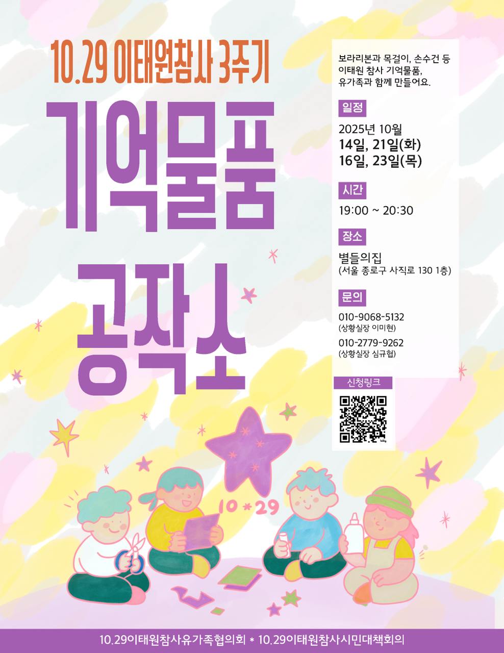 3주기를 앞두고 기억소통공간⭐️별들의집을 방문하거나 추모의 뜻을 보내주시는 분들과 나눌 기억물품이 많이 필요합니다. 유가족과 함께 진실의 별목걸이와 보라리본, 손수건을 만드는 활동에 함께 해주세요.