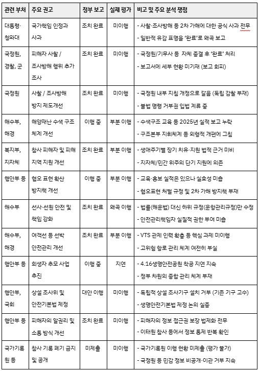 4. 종합적으로 2025년은 정부 보고서상의 ‘완료’ 숫자만 늘었을 뿐, 세월호참사 관련 핵심 개혁 과제는 멈춰버린 해로 평가된다. 또한, 국회 상임위의 이행점검 체계가 제대로 작동되지 않고 있으며, 권고 이행을 지속적으로 검증할 상설 기구의 필요성을 확인한 해이다.